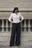 El styling se completa con un pañuelo al cuello que introduce un detalle sofisticado y sutil, elevando el conjunto sin sobrecargarlo. Los zapatos en tono oscuro anclan el look y mantienen la coherencia en la paleta.