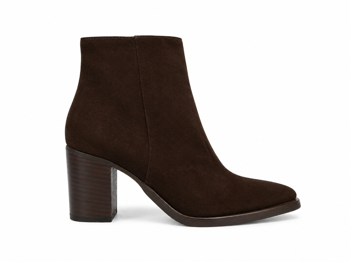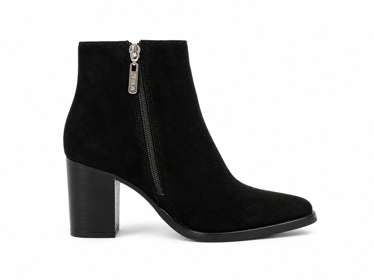 Confeccionada en cuero/gamuza (según versión), tiene una silueta minimalista con punta suavemente almendrada que estiliza sin exagerar. El cierre lateral facilita el calce y mantiene el diseño prolijo.