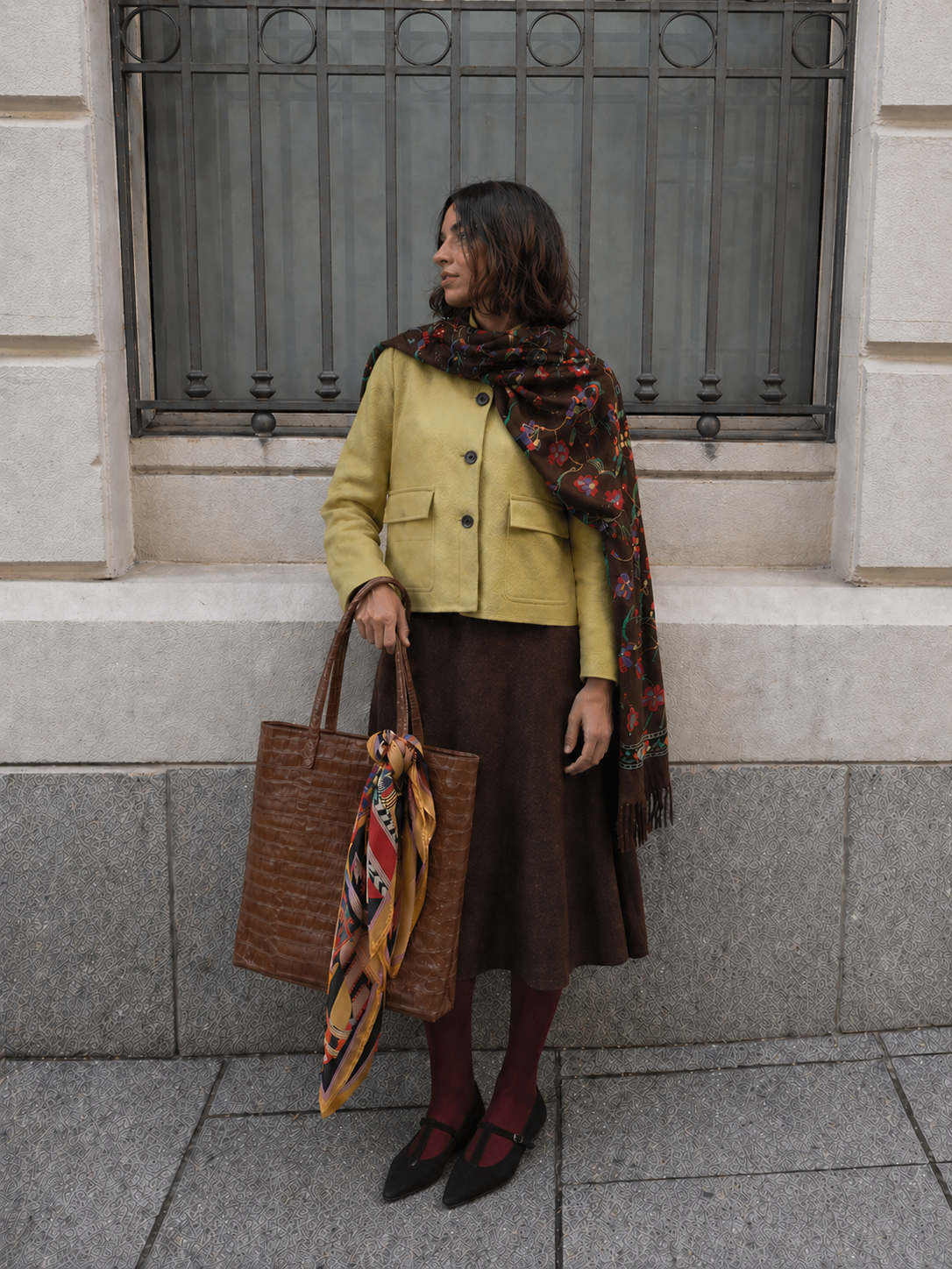 El chal bordado introduce un contraste con carácter, sumando color y un aire artesanal que eleva el look. La cartera de cuero croco y el pañuelo refuerzan el styling con textura y detalle.